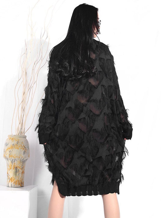 [EAM] 2023 New Spring Autumn Stand Collar Long Sleeve Black Perspective Split Joint Big Size Dress Women Fashion Tide JI78